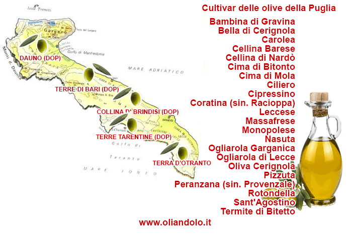 Collina di Brindisi (DOP), Dauno (DOP), Terre d'Otranto (DOP), Terre di Bari (DOP) "Castel del Monte", Terre di Bari (DOP) "Bitonto", Terre di Bari (DOP) "Murgia dei Trulli e delle Grotte", Terre Tarentine (DOP)